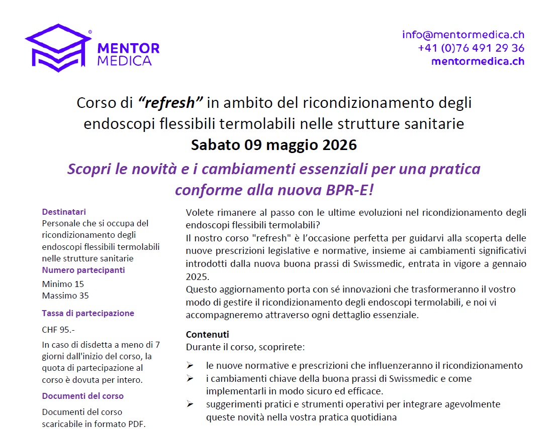 Lugano“CORSO DI “REFRESH” IN AMBITO DEL RICONDIZIONAMENTO DEGLI ENDOSCOPI FLESSIBILI TERMOLABILI NELLE STRUTTURE SANITARIE”