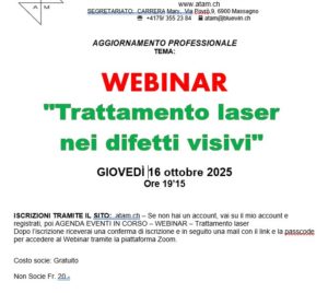Webinar: “Trattamento laser nei difetti visivi” La vendita è finita Iscrizioni entro il 13.10.2025 16 Ott 19:15 - 20:30 Zoom / Webinar