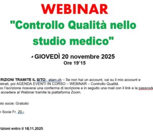 Webinar: “Controllo Qualità nello studio medico” Iscrizioni entro il 16.11.2025 20 Nov 19:15 - 20:30 Zoom / Webinar
