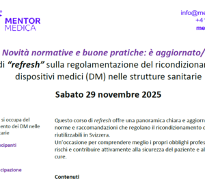 “Refresh sulla regolamentazione del RICONDIZIONAMENTO dei dispostivi medici “ Iscrizioni a: https://mentormedica.ch/formazione-continua/ 29 Nov 08:30 - 12:45 CPS Lugano