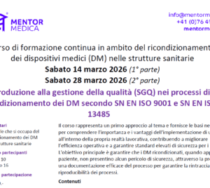 “INTRODUZIONE ALLA GESTIONE DELLA QUALITA’ (SGQ) NEI PROCESSI DI RICONDIZIONAMENTO DEI DM” Iscrizioni a: https://mentormedica.ch/formazione-continua/ 14 - 28 Mar 08:30 - 11:30 CPS Lugano