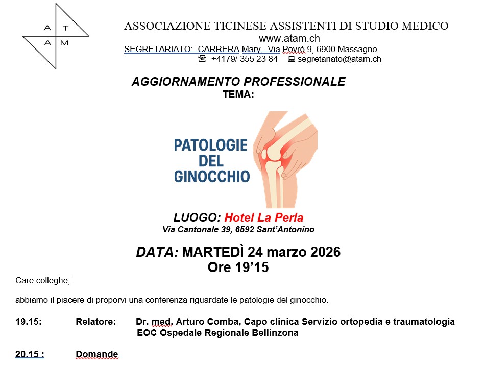 Home Tutti gli eventi - ATAM CONFERENZE “Patologie del ginocchio” Hotel La Perla St Antonino