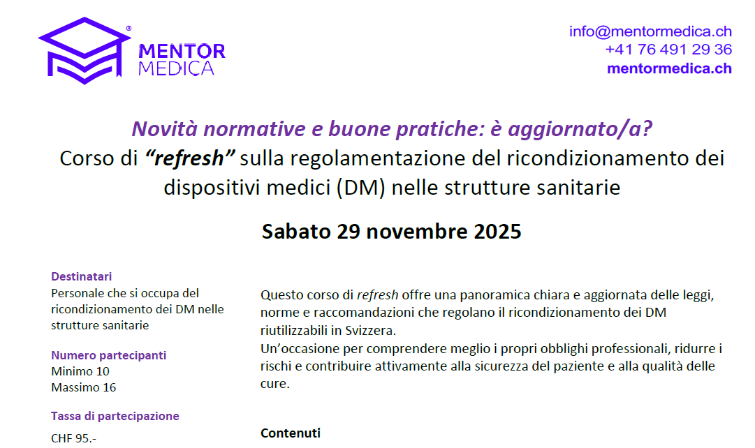 Home Tutti gli eventi - ATAM EVENTI VARI “Refresh sulla regolamentazione del RICONDIZIONAMENTO dei dispostivi medici “ “Refresh sulla regolamentazione del RICONDIZIONAMENTO dei dispostivi medici “ Per iscrizioni: mentormedica.ch/formazione-continua/ + Aggiungi a Google Calendar + esporta iCal / Outlook 00 giorni 00 ore 00 minuti 00 secondi Data 29 Nov 2025 Ora 08:30 - 12:45 Ora Locale Fuso orario: America/New_York Data: 29 Nov 2025 Ora: 02:30 - 06:45 Costo CHF95.00 Maggiori Info Leggi Tutto Luogo CPS Lugano Categoria EVENTI VARI Organizzatore MentorMedica MentorMedica Leggi Tutto Condividi questo evento