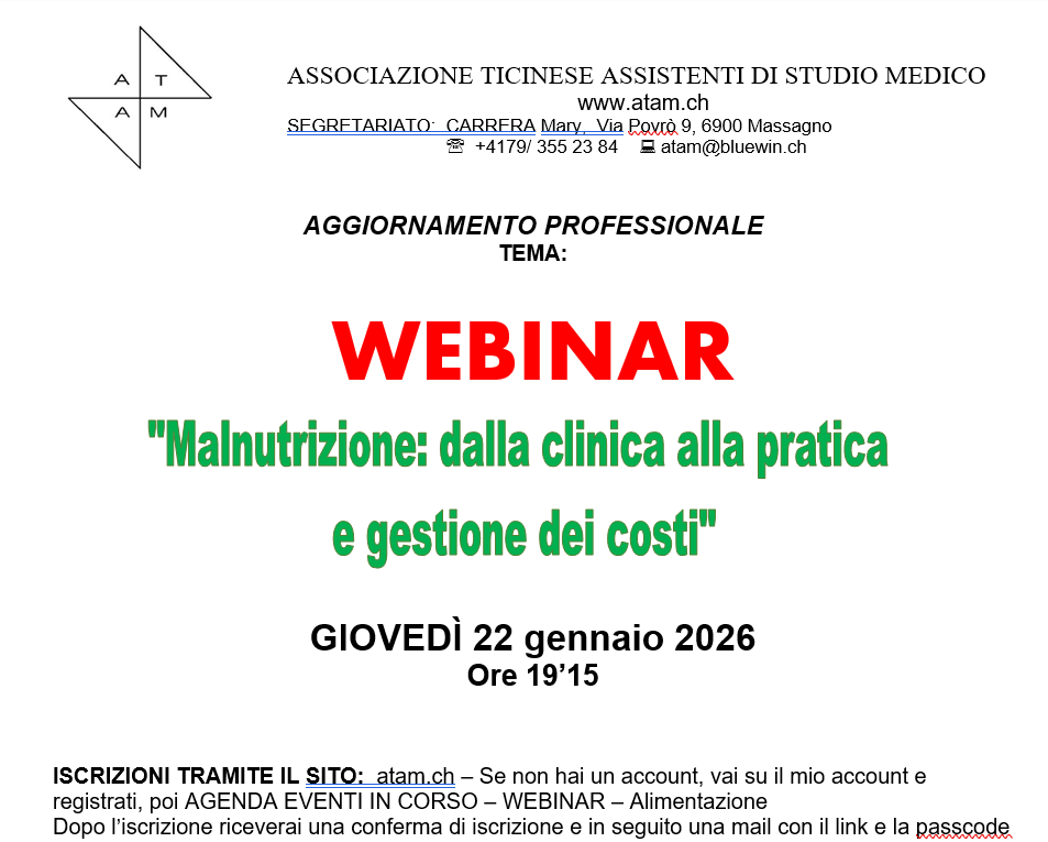 Home Tutti gli eventi - ATAM CONFERENZE Webinar: “Malnutrizione: dalla clnica alla pratica e gestione dei costi” Webinar: “Malnutrizione: dalla clnica alla pratica e gestione dei costi” Iscrizioni entro il 18.01.2026 + Aggiungi a Google Calendar + esporta iCal / Outlook 00 giorni 00 ore 00 minuti 00 secondi Prenota Evento Socie Available Biglietti: 50 GRATUITO The "Socie" ticket is sold out. You can try another ticket or another date. NON Socie CHF 20.00 Available Biglietti: 10 VERRA' INVIATA CEDOLA PER IL PAGAMENTO The "NON Socie" ticket is sold out. You can try another ticket or another date. Avanti Data 22 Gen 2026 Ora 19:15 - 20:30 Ora Locale Fuso orario: America/New_York Data: 22 Gen 2026 Ora: 13:15 - 14:30 Luogo Zoom / Webinar Categoria CONFERENZE Organizzatore ATAM Telefono +41 (79) 355 23 84 Email segretariato@atam.ch Associazione Ticinese Assistenti di studio Medico REGISTRAZIONE Condividi questo evento